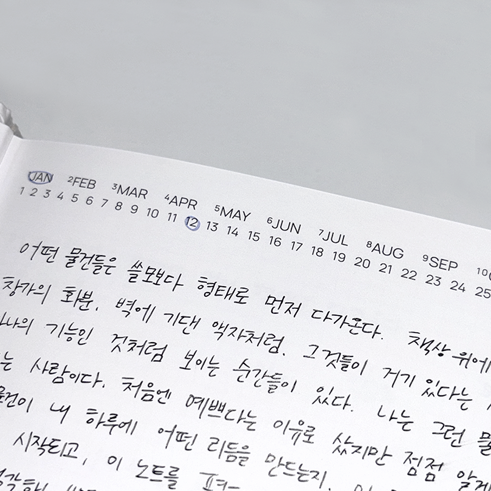 · 제본은 사용하며 길들여집니다. 첫 펼침 시 소리나 경직감이 느껴질 수 있으나, 구간별로 가볍게 펼치면 점차 부드러워집니다.