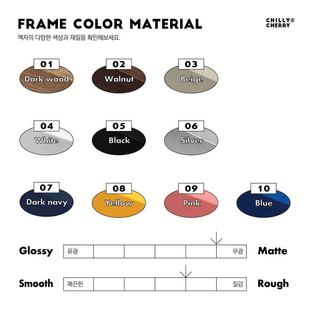 · 프레임 액자 세트를 구매하시면, 배접 후 액자에 넣어 완성형 액자 제품으로 발송됩니다. · 상세 촬영 이미지는 연출된 컷으로, 프린트 액자의 크기와 액자의 재질감은 실제 제품과 다소 차이가 있을 수 있습니다. 구매 전 상세 내용을 참고하여 정확한 정보를 확인해 주세요. · 생산 과정에서 미세한 스크래치, 찍힘, 잉크 튐 등의 현상이 발생할 수 있으며, 이는 제품의 제작 공정상 불가피한 부분으로 양해 부탁드립니다. · 모니터 성능, 해상도, 빛, 조명에 따라 실제 제품의 색상과 차이가 있을 수 있으며, 이는 불량 사유에 해당하지 않습니다. · 주문 제작 제품은 단순 변심으로 인한 환불이 불가능하므로, 주문 전 사이즈, 컬러 등 상세 옵션을 충분히 확인해 주세요. · 프린트 액자의 일부 제품은 프린트만 구매 시와 프레임 액자 세트 구매 시 옵션 선택에 따라 여백의 차이가 있을 수 있습니다. · 프레임 액자는 산화 방지를 위해 도금 후 엠보 필름 작업을 거쳐 자연스러운 질감이 느껴질 수 있습니다. · 프린트 액자의 일부 제품은 의도된 노이즈 질감 처리가 되어 있어 자글자글한 느낌을 줄 수 있으며, 이는 디자인의 일부로 인쇄 불량이 아닙니다. · 프레임 액자의 날카로운 모서리는 연마 과정을 통해 부드럽게 처리되었으나, 알루미늄 액자의 특성상 일부 날카로움이 남을 수 있으니 개봉 및 설치 시 주의해 주세요. · 프린트만 구매 시, 한 방향으로 말아 패키징되어 발송되며 반대 방향으로 말아 펼친 뒤 무거운 물체로 눌러주면 자국 없이 펴집니다. · 액자 분해 및 조립 방법은 <Notice> 게시판의 설명을 참고해 주세요.